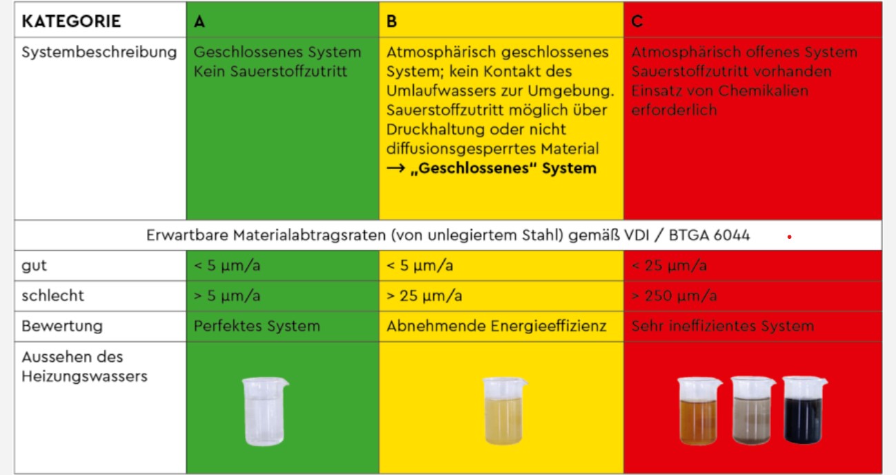 Die Vermeidung von Lufteintrag, Biofilm oder Steinbildung durch Kalkablagerungen sind also wesentliche Ziele zur Aufrechterhaltung des effizienten Wärmeübergangs. Deshalb gilt für die Effizienzklasse A (das sind korrosionstechnisch geschlossene Anlagen) des Wärmetransportmediums Wasser:
