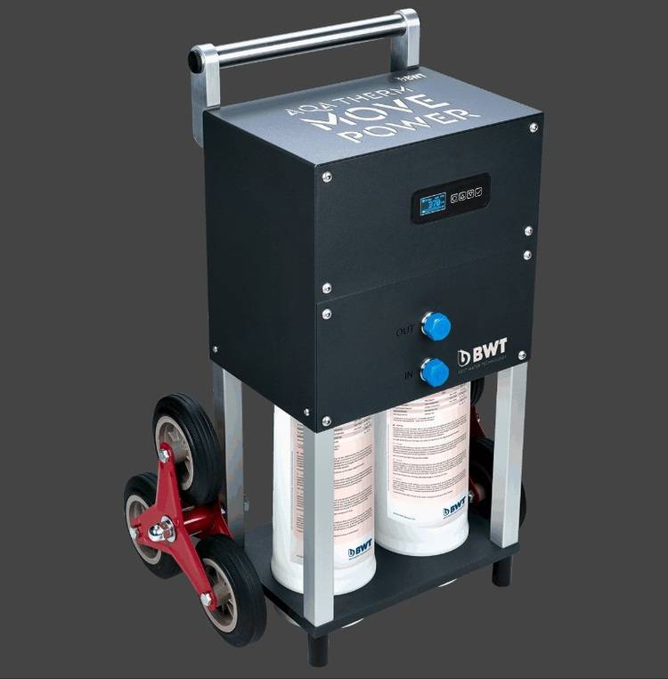 Nach dem Vitas-Konzept gilt es, Umweltbelastungen durch übermäßigen Einsatz von Mischbett-Harzen zur Entsalzung zu vermeiden. Gerade bei der Erstbefüllung eines Heizungssystems empfiehlt es sich nicht nur aus Kostengründen (entsalztes Füllwasser ist z. B. mit dem System AQA therm MovePower (Bild 7) für weniger als 4 Ct/l herzustellen) auf den Einsatz von Entsalzungsharzen zu verzichten und das Wasser stattdessen mit einer Membrantechnologie zu entsalzen und in die Anlage einzufüllen.