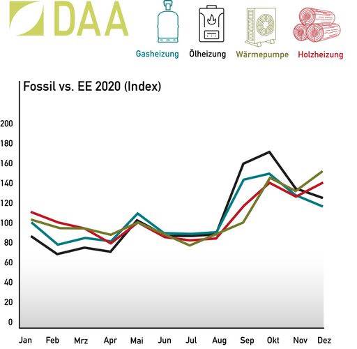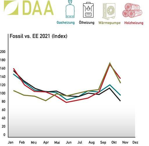 Fossile vs. Erneuerbare: Die DAA Deutsche Auftragsagentur GmbH aus Hamburg (DAA) hat ihre Anfragezahlen 2021 für verschiedene Heizungsarten gegenübergestellt und zudem mit denen von 2020 verglichen. Das Ergebnis: Die regenerativen Heizungssysteme verzeichnen deutliche Zuwächse, während es bei den fossilen einen leichten Abwärtstrend gibt.