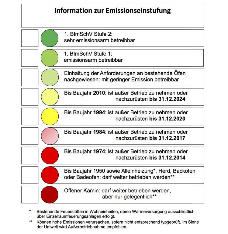 Die Feuerstättenampel ist ein Merkblatt und zeigt anhand der Farben Rot, Gelb und Grün, wie mit der Feuerstätte in Zukunft zu verfahren ist. Die einfache und anschauliche Einordnung anhand der Farben zeigt dem Betreiber auf, welche Emissionswerte seine Feuerstätte hat und wann sie veraltet ist und somit gegen ein modernes Gerät ausgetauscht werden muss: