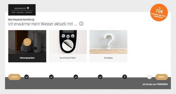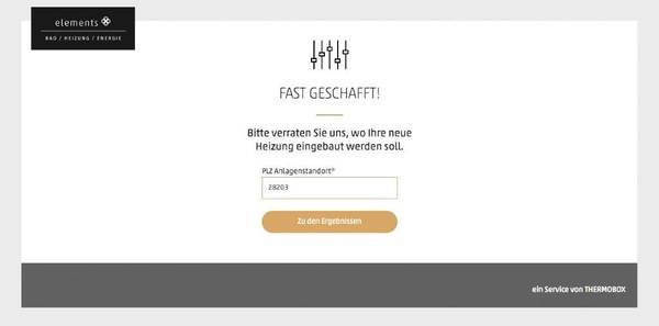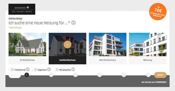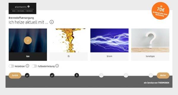 Über den Heizungskonfigurator kann er sich mit wenigen Klicks eine Angebotsübersicht zu verschiedenen Wärmeerzeugungsanlagen anzeigen lassen. Nach der Recherche und Erstkonfiguration folgt der Vor-Ort-Termin durch einen Fachhandwerksbetrieb aus der Region. Dafür versendet der Endverbraucher eine Online-Angebotsanfrage oder nimmt mit einem telefonischen Rückrufwunsch Kontakt zum Elements-Kundencenter auf. Dieses ergänzt gemeinsam mit dem Endkunden Wünsche und Anforderungen und vereinbart einen Beratungstermin mit einem Fachhandwerker aus dem Elements-Partnerpool.