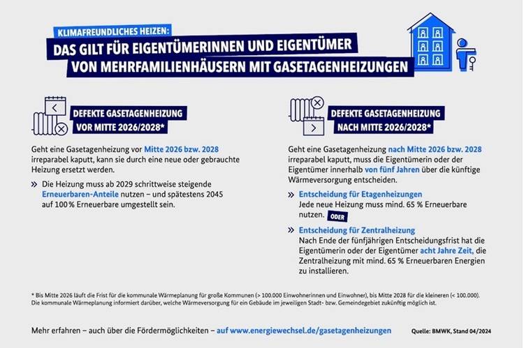 - Bis Mitte 2026 bzw. 2028 (bzw. bis zur früheren verbindlichen Einführung der kommunalen Wärmeplanung) kann die defekte Gasetagen- oder Einzelheizung ersetzt werden: entweder durch ein neues Heizsystem, welches 65 Prozent erneuerbare Energien nutzt, oder durch eine neues oder gebrauchtes Gasheizgerät, das mit 100 Prozent fossilen Energien betrieben werden darf. Ab 2029 muss es jedoch schrittweise steigende erneuerbare Brennstoffanteile nutzen: 15 Prozent ab 2029, 30 Prozent ab 2035 und 60 Prozent ab 2040. Ab 2045 sind 100 Prozent Erneuerbare verpflichtend.