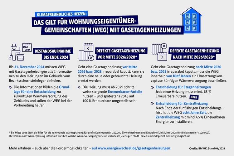 - Muss die erste Gasetagenheizung (oder Einzelraumfeuerung) nach Ende der örtlichen Wärmeplanung (spätestens Mitte 2026 bzw. 2028) ersetzt werden, hat die Hausverwaltung umgehend die Wohnungseigentümerversammlung einzuberufen. In dieser muss die WEG darüber beraten, wie eine klimafreundliche Wärmeversorgung des Gebäudes umgesetzt werden soll.