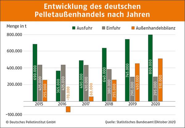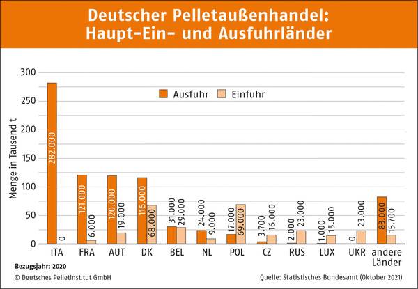 Bislang war es noch so, dass die Ausfuhr von Holzpellets aus Deutschland die Einfuhr deutlich überstieg (ca. 250.000 bis 500.000 t in der Bilanz, wechselnd, Zahlen seit 2015). In den Jahren davor lagen die Zahlen i. d. R. immer bei 400.000 t. Pellets nach Deutschland kommen aus den angrenzenden Nachbarländern Österreich, Tschechien, Polen, aber auch bereits aus Russland oder der Ukraine.