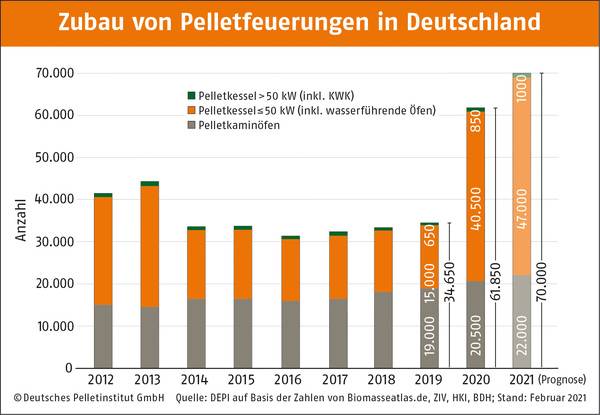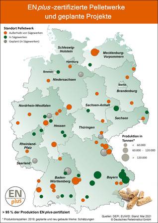 Nach derzeitigem Stand (Quelle: DEPI, Februar 2021) sehen die Inlandszahlen wie folgt aus: Die theoretische Kapazität aller Pelletwerke in Deutschland zusammengenommen beträgt 4,275 Mio. t, die tatsächliche Produktion 3,1 Mio. t und der Verbrauch 2,33 Mio. t (Die Zahlen beziehen sich auf 2020). Für 2021 wird ein Sprung der Produktionskapazität um 500.000 t auf 4,725 Mio. t prognostiziert, da aktuell laut DEPI an sieben Sägewerks-Standorten in Deutschland neue Pelletwerke geplant sind. Die laufende Produktion soll sich in diesem Jahr moderat um 200.000 t auf 3,3 Mio. t erhöhen. Interessant ist allerdings der prognostizierte Sprung beim Verbrauch von 2020 auf 2021, um 400.000 t. In den Vorjahren gab es nur maue Zuwächse zwischen 30.000 und 100.000 t.