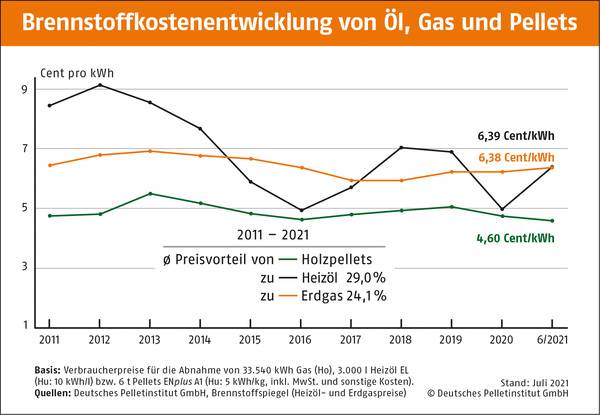 Preisschwankungen bei Pellets treten zwar auch im Jahresvergleich auf (z. B. waren Holzpellets im Winter 2019/2020 mit durchschnittlich ca. 260 €/t teurer als im Winter 2020/2021 mit rund 240 €/t). Doch im Rückblick auf die letzten 10 Jahre (2011 - 2021) war die Brennstoffkostenentwicklung von Pellets sehr stabil. Der Wert pendelte immer um die 5 ct/kWh und der durchschnittliche Preisvorteil von Holzpellets zu Heizöl betrug in diesem Zeitraum 29 % und zu Erdgas 24,1 % (Angaben des Deutschen Pelletinstituts, DEPI).