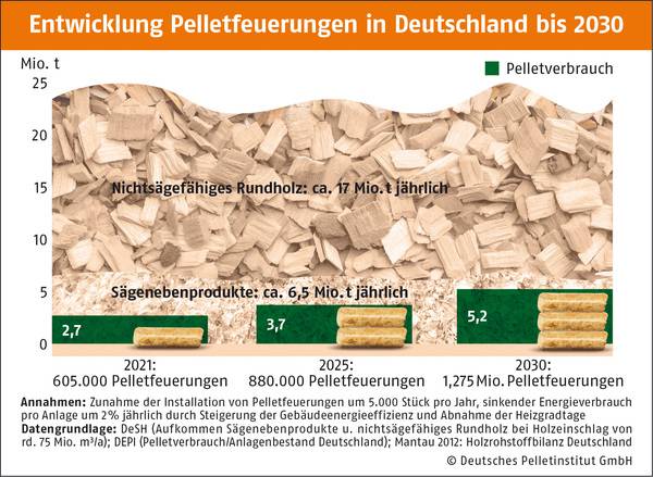 Das DEPI prognostiziert aufgrund der aktuellen Absatz-Entwicklung eine Verdoppelung der installierten Pelletfeuerungen in Deutschland binnen 10 Jahren, von 605.000 Feuerungen derzeit (2021) auf 1,275 Mio. Pelletfeuerungen in 2030. Dabei wird eine Steigerungsrate von plus 5.000 Stück mehr Installationen pro Jahr als zum Vorjahr angenommen. Und obwohl auch angenommen wird, dass der Energieverbrauch um 2% jährlich sinken wird (z. B. durch höhere Dämmstandards im Neubau oder über Gebäudesanierungen) und die Zahl der Heizgradtage abnehmen wird (was realistisch ist aufgrund des Klimawandels), wird durch die angenommene Verdoppelung des Pelletfeuerungsbestands bis 2030 sich prognostisch auch der Pelletverbrauch fast verdoppeln (2021: 2,7 Mio. t, 2030: 5,2 Mio. t).