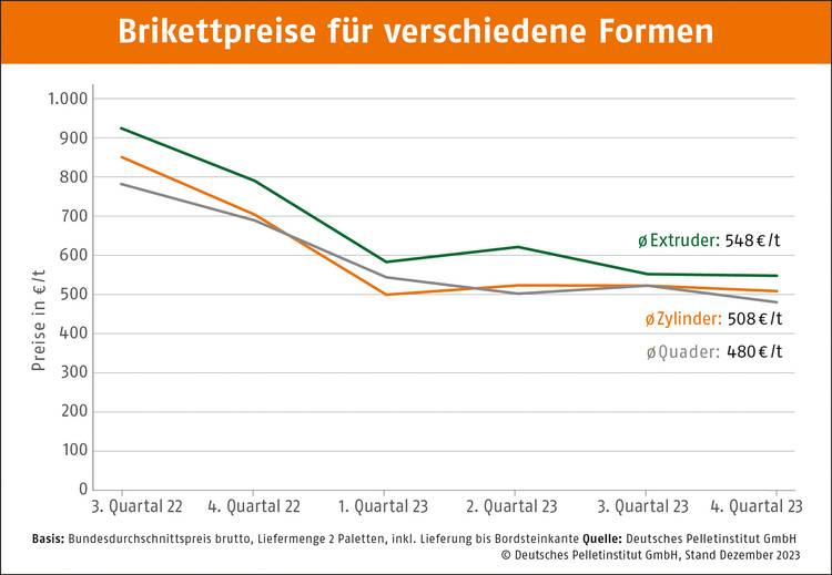 Der Preis für quaderförmige Briketts (aus Presskammerpressen) liegt im vierten Quartal 2023 bei 480 Euro pro Tonne (t), gefolgt von den zylinderförmigen Strangbriketts (Exzenterpressen) mit 508 Euro/t. Beide Sorten notieren somit unter dem Preis des vorigen Quartals, der durchschnittlich je 521 Euro/t betrug.
