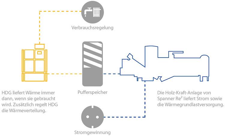 Die erzeugte Wärme speisen beide Anlagen in einen gemeinsamen Speicher ein. Hier kommt das Puffermanagement von HDG ins Spiel. Es garantiert, dass möglichst viel Wärmeenergie der Spanner Re² Holz-Kraft-Anlage genutzt wird. Das optimiert die Laufzeit und damit die Wirtschaftlichkeit der Anlage. Gleichzeitig ist die Wärmeversorgung jederzeit sichergestellt, denn das Hackschnitzel-Heizsystem von HDG schaltet sich bei Bedarfsspitzen flexibel und vollautomatisch zu. Der Stromertrag der Holz-Kraft-Anlage kann sowohl ins Netz abgegeben als auch für den Eigenbedarf verwendet werden.
