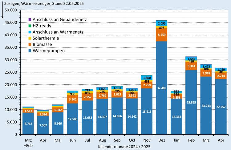 Von Januar bis Ende April 2025 sind mit insgesamt 101.395 mehr „Zusagen ohne Zusatzanträge“ als im Vorjahr vom 27. Februar bis Ende September gegeben worden. In welchem Umfang politische Aussagen und nationale wie auch globale politische Entwicklungen sowie Informationskampagnen der Wärmepumpenbranche die Nachfrage zuletzt geprägt haben, ist weiterhin offen wird sich erst in den nächsten Monaten zeigen.