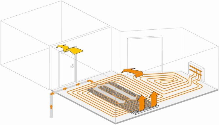 Das Kühlregister sorgt für Nachkühlung und Entfeuchtung des Zuluftvolumenstroms. Bei Bedarf führt Airconomy gekühltes Wasser durch die Rohrregister im Boden: Stille Kühlung – nach diesem Prinzip wird über den Boden die Wärme aus dem Raum abgeführt. Die einströmende Luft der kontrollierten Raumlüftung wird so automatisch vorgekühlt, diese ist somit etwas trockener und wird als angenehmer empfunden.