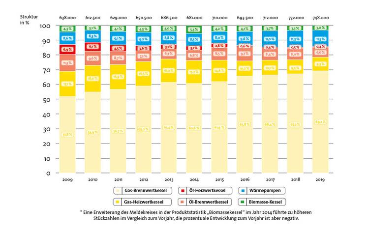 Platz zwei der Absatzstatistik belegte, wie schon in 2018, mit 86.000 verkauften Geräten die Wärmepumpe – allerdings bei gedrosseltem Wachstum von 2% (2018: plus 8%). Der Absatz von Ölheizungen ging um 17% zurück. Die Nachfrage nach Biomassekesseln schwächte sich ebenfalls leicht ab (minus 1%).