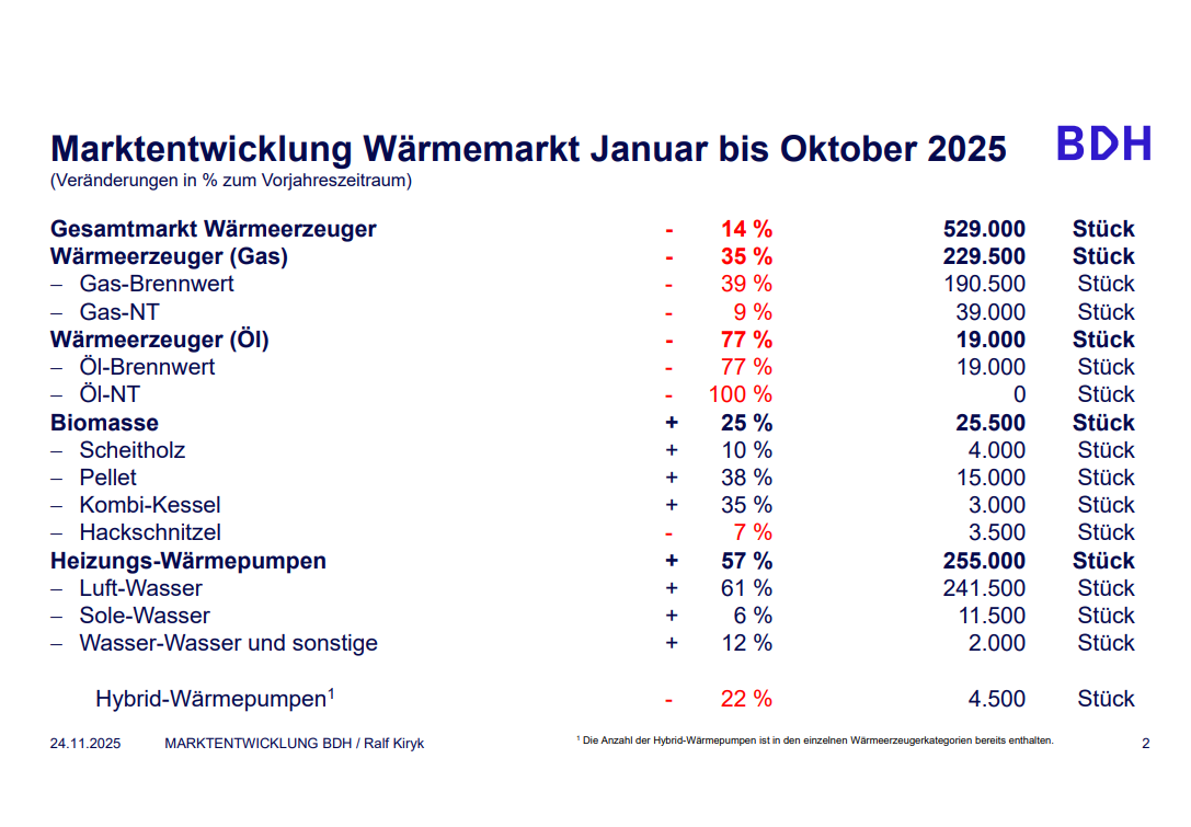 Einzig der Absatz von Wärmepumpen verzeichnet eine positive Entwicklung. Bis Oktober 2025 wurden über alle Wärmepumpen-Technologien hinweg rund 255.000 Geräte verkauft – ein Zuwachs von 57 Prozent im Vergleich zum Vorjahreszeitraum. Für das Gesamtjahr prognostiziert der BDH rund 284.000 abgesetzte Wärmepumpen und damit ein Wachstum von 47 Prozent gegenüber 2024.