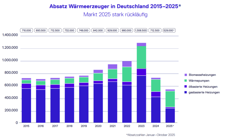 Die deutsche Heizungsindustrie verzeichnet weiterhin einen deutlichen Nachfragerückgang. Nach aktuellen Zahlen des Bundesverbands der Deutschen Heizungsindustrie (BDH) wurden bis einschließlich Oktober 2025 rund 529.000 Heizungen verkauft. Damit steuert die Branche auf eines der schwächsten Ergebnisse der vergangenen zehn Jahre zu.