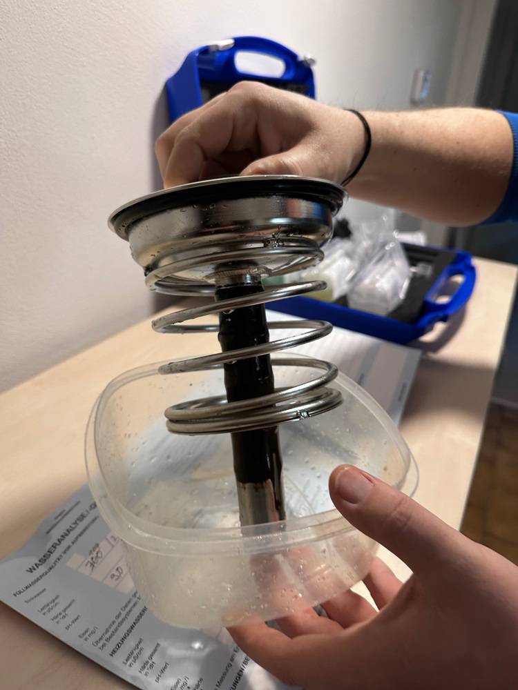 Vor Ort erfolgte zunächst eine Sichtkontrolle des Heizwassers und eine Messung von Gesamthärte, pH-Wert und der Leitfähigkeit. Ein wichtiger Schritt, denn: Die Heizwasseraufbereitung nach VDI 2035 ist bei allen Herstellern die Voraussetzung für eine Gewährleistung wie auf Wärmeerzeuger, Wärmetauscher und Umwälzpumpen. Entspricht das Heizwasser nicht den VDI-Werten, kann die Garantie erlöschen. Sauberes Heizwasser schützt Fachhandwerker somit vor Haftungsrisiken und sichert Garantieansprüche.
