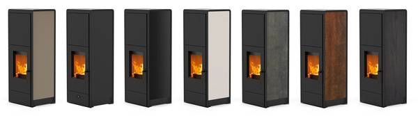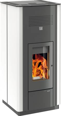 Der Holzofen in Ellipsenform ist mit einem Overnight-System zum Speichern und Freigeben von Wärme ausgestattet. Die Verbrennungskontrolle erfolgt durch einen einzigen versenkbaren Hebel, der Griff schließt automatisch. Die Seitenteile aus Metall sind in den Farben Black und Aluminium erhältlich.