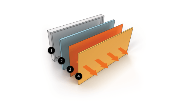 Hinter dem Heizelement befindet sich eine Wärmedämmschicht, die dafür sorgt, dass die Wärme ausschließlich nach vorne in den Raum abgegeben wird.