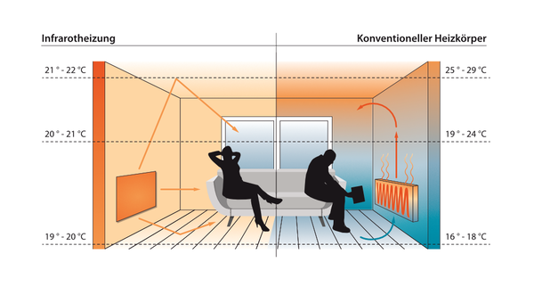 Weil der Mensch die Infrarotstrahlung als wärmer und angenehmer empfindet, lässt sich die Raumtemperatur um etwa 2 Grad Celsius niedriger einstellen. Im Vergleich zu einer ganzflächigen Fußbodenheizung kann es bei einer Infrarotheizung, abhängig von der Platzierung, vom Raum und der Möblierung, auch Bereiche mit ungleichmäßigem Temperaturverlauf geben.