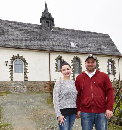 Wohnen in der Kirche? Dass das funktioniert, beweisen Sindy (26) und Reinhard (29) Hoffmann aus Grießbach im sächsischen Erzgebirgskreis. Im März 2016 kauften sie eine alte Kirche aus den 20er Jahren und bauen sie seitdem zum Wohnhaus um – und zwar klimafreundlich mit einer Pelletheizung, Deutschlands 400.000sten. Zu diesem Jubiläum reiste DEPV-Geschäftsführer Martin Bentele an, um die Anlage auszuzeichnen und den Betreibern einen Gutschein für drei Tonnen Pellets zu überreichen.