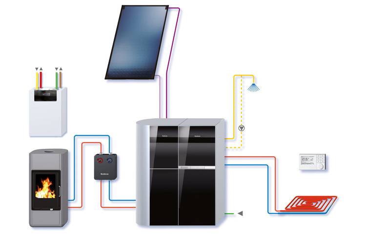 Feuerstätten eignen sich daher als regenerative Systemergänzung, mit der sich ihre Wärme nicht nur in einem Raum, sondern auch an anderer Stelle nutzen lässt. Hersteller wie der Systemspezialist Buderus bieten passende Systemkomponenten wie Puffer- oder Kombispeicher und Hocheffizienzpumpen, die hinsichtlich ihrer Leistung und Installation aufeinander abgestimmt sind und die Einbindung des Ofens in das Heizsystem des Hauses ermöglichen. Bei den Kaminöfen der Linie Titanium von Buderus heizen beispielsweise bei einer Nennwärmeleistung von 8 kW 35 % der Wärme den Aufstellraum und 65 % erhitzen über den Wärmetauscher das Heizwasser für die Unterstützung der Raumheizung und der Trinkwassererwärmung.