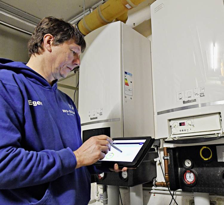 Mit Diagnostic Plus greift der Techniker der Wohnungsgenossenschaft Ratingen auch digital auf technische Unterlagen der jeweiligen Heizungsanlage zu. „Ich sehe sofort, welche Teile vor Ort verbaut sind“, so Eger. „Das ist eine echte Verbesserung und Zeitersparnis gegenüber früher, als ich mich manchmal mit dem Smartphone im Internet schlaumachen musste, weil man ja nicht alle Anlagen auswendig kennt.“