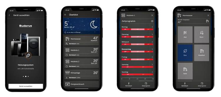 Beispielsweise sind die Buderus Luft/Wasser-Wärmepumpen Logatherm WLW196i AR sowie die neue Sole/Wasser-Wärmepumpe Logatherm WSW196i und das Buderus Gas-Brennwertgerät Logamax Plus GB192i (bis 25 kW) oder der Öl-Brennwertkessel Logano Plus KB195i werkseitig internetfähig und Smarthome-fähig. Mit der App MyBuderus kann man die Geräte sofort von überall via Smartphone und Tablet-PC kontrollieren und bedienen.
