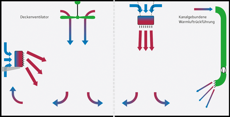 Mit Luftauslässen oder Ventilatoren kann warme Luft sowohl raumfüllend verteilt als auch zielgerichtet dorthin geführt werden, wo diese benötigt wird. Effizient gelingt das auch mit Erdgas als Energieträger und in großen Hallen. Beschrieben werden die Zusammenhänge beispielsweise in einem neu erschienenen Handbuch „Erdgasbetriebene Warmluftheizungen“ des BDEW Bundesverband der Energie- und Wasserwirtschaft e. V..