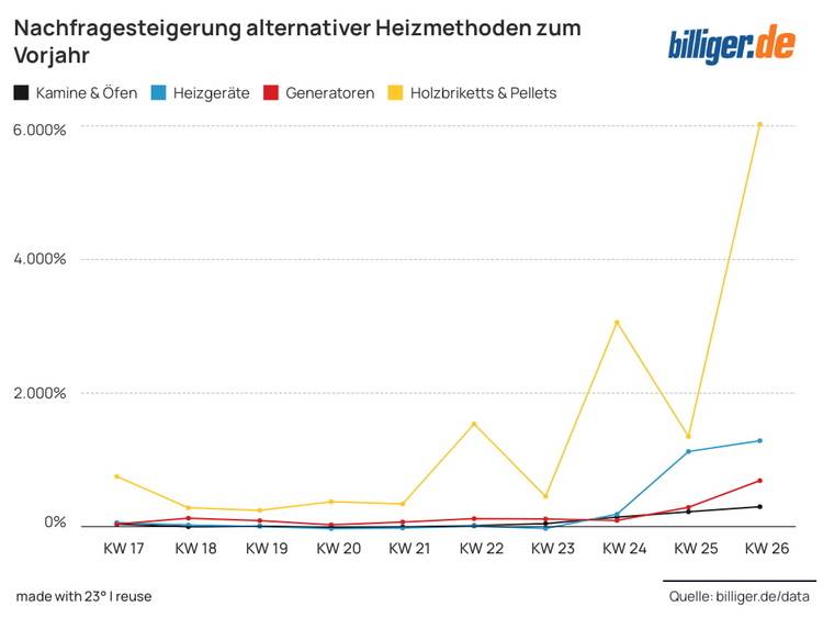 Das Preisvergleichsportal billiger.de hat Nachfrage und Preise analysiert. Dabei haben die Experten seit Mitte Juni eine explodierende Nachfrage nach Kaminöfen, Heizgeräten und entsprechenden alternativen Brennstoffen wie Holzpellets oder Holzbriketts festgestellt.