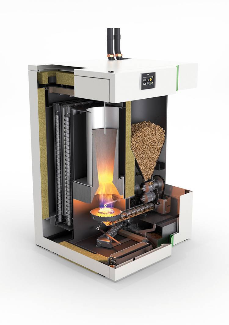 Die neuen, großen Condens Pelletkessel weisen mit 96 x 92 cm ein kompaktes Maß auf. Verschiedene Anschlussmöglichkeiten lassen eine optimale und einfache Installation auch an ein vorhandenes Heizsystem zu – für den Fachhandwerker komfortabel und zeitsparend. Durch die seitlichen und oben angeordneten Zu- und Abgänge können die Kessel eck- oder wandbündig eingebaut werden. Zudem sind die neuen Pelletkessel je nach örtlichen Gegebenheiten zerlegbar, sodass eine Einbringung in den Heizraum bereits ab 80 cm Türbreite möglich ist.
