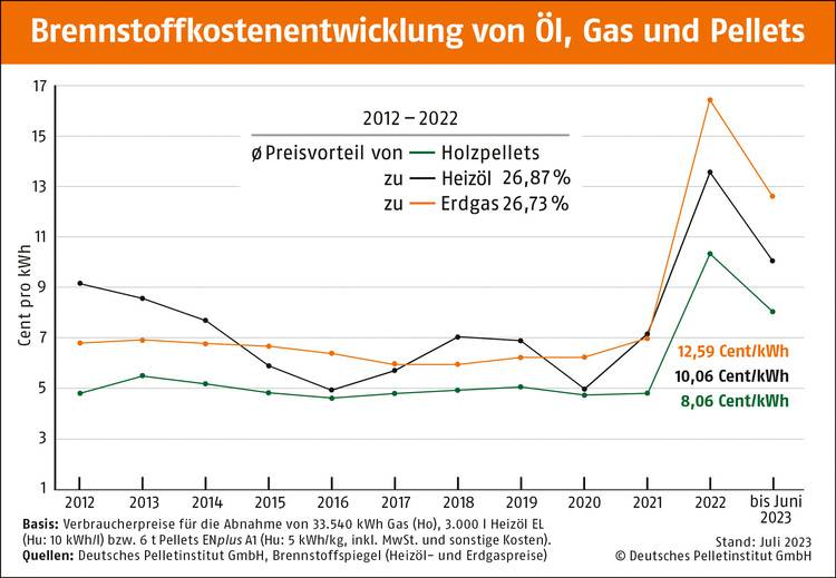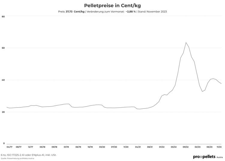 Bis Mai 2022 war der Preis weiter gestiegen (rund 336 €/t), danach schoss er auf rund 634 €/t im Peak bis Oktober in die Höhe, um danach im gleichen Tempo wieder hinunter zu rauschen, wenn auch das Ausgangsniveau vor dem Preissprung nicht wieder erreicht wurde. In Deutschland war der Preis zum selben Zeitpunkt sogar noch höher. Im September 2022 wurde im Bundesdurchschnitt der Wert von 763,76 €/t erreicht, wenn 6t abgenommen würden. Ein astronomischer, nie dagewesener Preis.