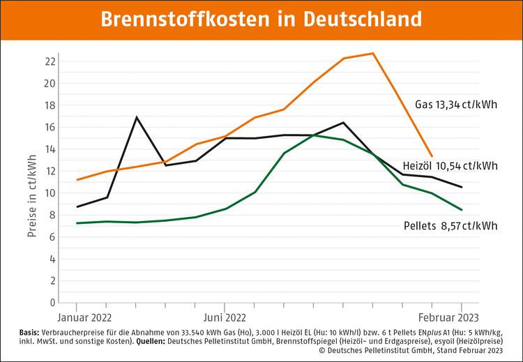 Der Preis für Holzpellets fällt im Februar erneut stark und ist weiterhin deutlich unter dem von Öl und Gas. Laut dem Deutschen Pelletinstitut DEPI kostet eine Tonne (t) Pellets im Bundesdurchschnitt 428,52 Euro. Das sind 14,1 Prozent weniger als im Vormonat und 14,6 Prozent mehr als im Februar 2022.