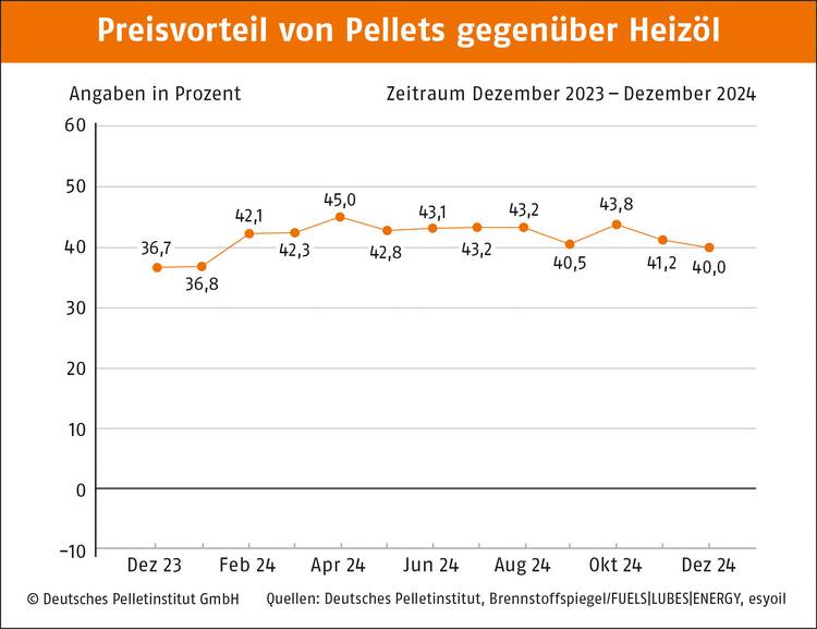 Laut Deutschem Pelletinstitut beträgt der Preis für eine Tonne Holzpellets im Dezember durchschnittlich 286,04 Euro. Somit erhöht sich der Pelletpreis im Vergleich zu den Vormonaten November und Oktober um rund 2,5 Prozent, liegt aber deutlich unter dem Vorjahresniveau (Dezember 2023: 329,25 Euro). Eine Kilowattstunde klimafreundliche Wärme kostet derzeit 5,72 Cent pro. Der Preisvorteil gegenüber Erdgas liegt bei rund 46 Prozent, etwa 40 Prozent sind es gegenüber Heizöl.
