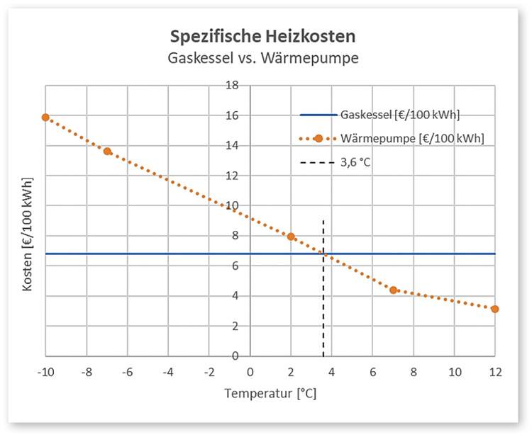 Die Kipppunkte lassen sich präzise bestimmen. Einen Normnutzungsgrad von 98 % für einen Gaskessel angenommen, ergibt sich bei einem Strompreis von 0,28 €/kWh und einem Gaspreis von 0,0662 €/kWh der Kosten-Kipppunkt bei 3,6 °C (Abb. 2).