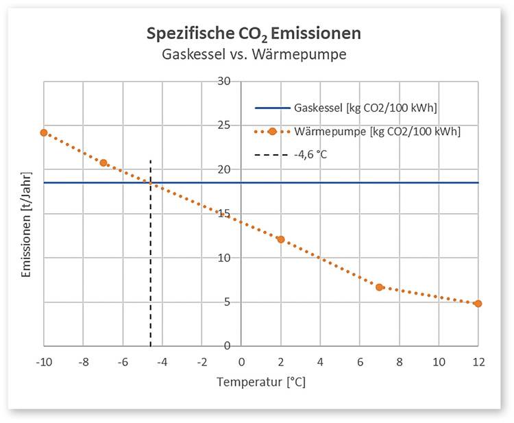 Die Emissionen betrachtet, wird der Kipppunkt schon bei -4,6 °C erreicht (CO₂-Emissionen Strom: 0,427 kg/kWh, CO₂-Emissionen Erdgas: 0,181 kg/kWh) (Abb. 3). Für den betrachteten Fall ist es also kostengünstiger, die Klimaanlage oberhalb 3,6 °C Außentemperatur zuzuschalten und den Gaskessel abzuschalten oder ihn im Parallelbetrieb mit abgesenkten Sollwerten an den Temperaturreglern weiter zu betreiben.