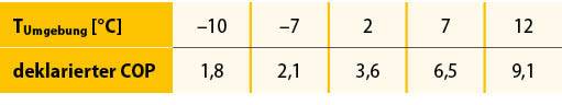 Die Effizienz von Wärmepumpen definiert ihre Leistungszahl (engl.: coefficient of performance = COP). Sie gibt das Verhältnis von abgegebener Wärmeleistung zur eingesetzten Leistung an. Bei mechanischen Wärmepumpen mit Kompressor – wie in Luft-Luft-Klimageräten verbaut - wird die eingesetzte Leistung in Form von elektrischer Energie eingebracht. Der COP gibt also das Verhältnis von erzeugter Wärme zu eingesetztem Strom an. Moderne Klimageräte haben im Heizbetrieb etwa die in Abb. 1 angegebenen Leistungsdaten.