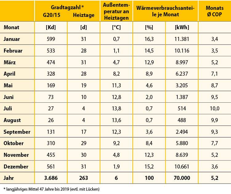 Weiterhin kann auf Basis der Wärmepumpen-Leistungszahlen an verschiedenen Temperatur-Stützpunkten die mittlere Leistungszahl in den jeweiligen Monaten anhand der korrespondierenden mittleren Temperatur an den Heiztagen interpoliert werden.