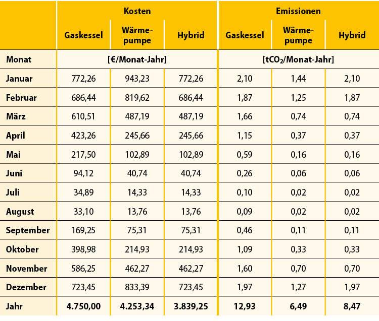 Es zeigt sich, dass der Gaskessel in den Monaten Januar, Februar und Dezember niedrigere Kosten verursacht als die Wärmepumpe. Damit wird etwas weniger als 50 % des jährlichen Heizbedarfes abgedeckt. In den restlichen neun Monaten kann die Wärmepumpe die verbleibenden etwas über 50 % des Jahres-Gesamtbedarfs kostengünstiger zur Verfügung stellen.