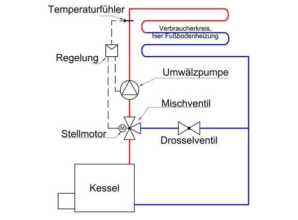 Eine Beimischschaltung lässt sich sowohl mit einem Drei-Wege- als auch mit einem Vier-Wege-Stellglied realisieren. Die Leistungsregelung im Verbraucherkreis erfolgt hier einfach durch Beimischung eines Teilstroms aus dem Rücklauf des Verbraucherkreises zum Vorlaufstrom des Verbrauchers. Typisch für die Beimischschaltung, die häufig auch als Mischregelung bezeichnet wird, ist die Anordnung der Umwälzpumpe im Verbraucherheizkreis.