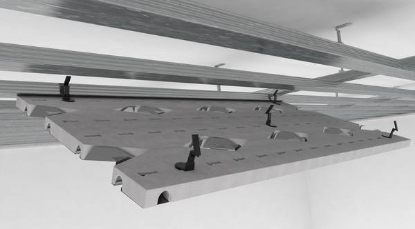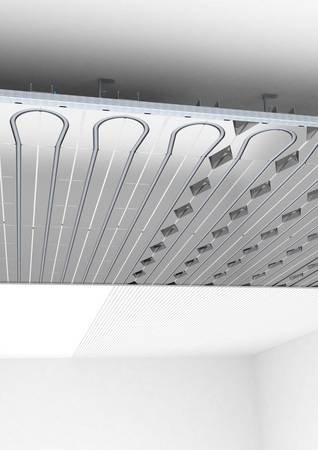 Normalerweise werden die Module zwischen die CD-Profile der abgehängten Decke eingelegt und montiert, was die aktivierte Fläche um ein Drittel verringert. Das ist beim PYD-ALU Topmodul anders: Das System überspannt die gesamte Unterkonstruktion und lässt sich mit den PYD-Modulhaltern werkzeuglos im Feinrost der Decke befestigen.