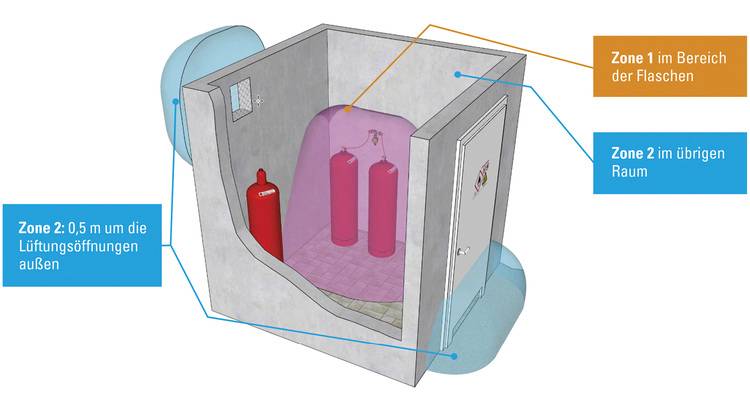 Die TRF 2021 sagt nun, dass für solche Räume für Flaschen dieselben Anforderungen gelten wie für solche, in denen ein Behälter steht. Unter anderem bedeutet das: Die Tür des Raumes muss sich nach außen öffnen und darf nur ins Freie führen, zu angrenzenden Räumen darf es keinen Durchgang geben und der Raum benötigt zwei Entlüftungsöffnungen – eine am Boden und eine unter der Decke. Für betriebene Flaschen kommen in der TRF 2021 Ex-Zonen hinzu, für die besondere Regeln etwa zu Zündquellen bestehen. Eine Ex-Zone 1 befindet sich im Bereich der Flaschen, jeweils eine Ex-Zone 2 im übrigen Raum sowie um die Entlüftungsöffnungen außen.