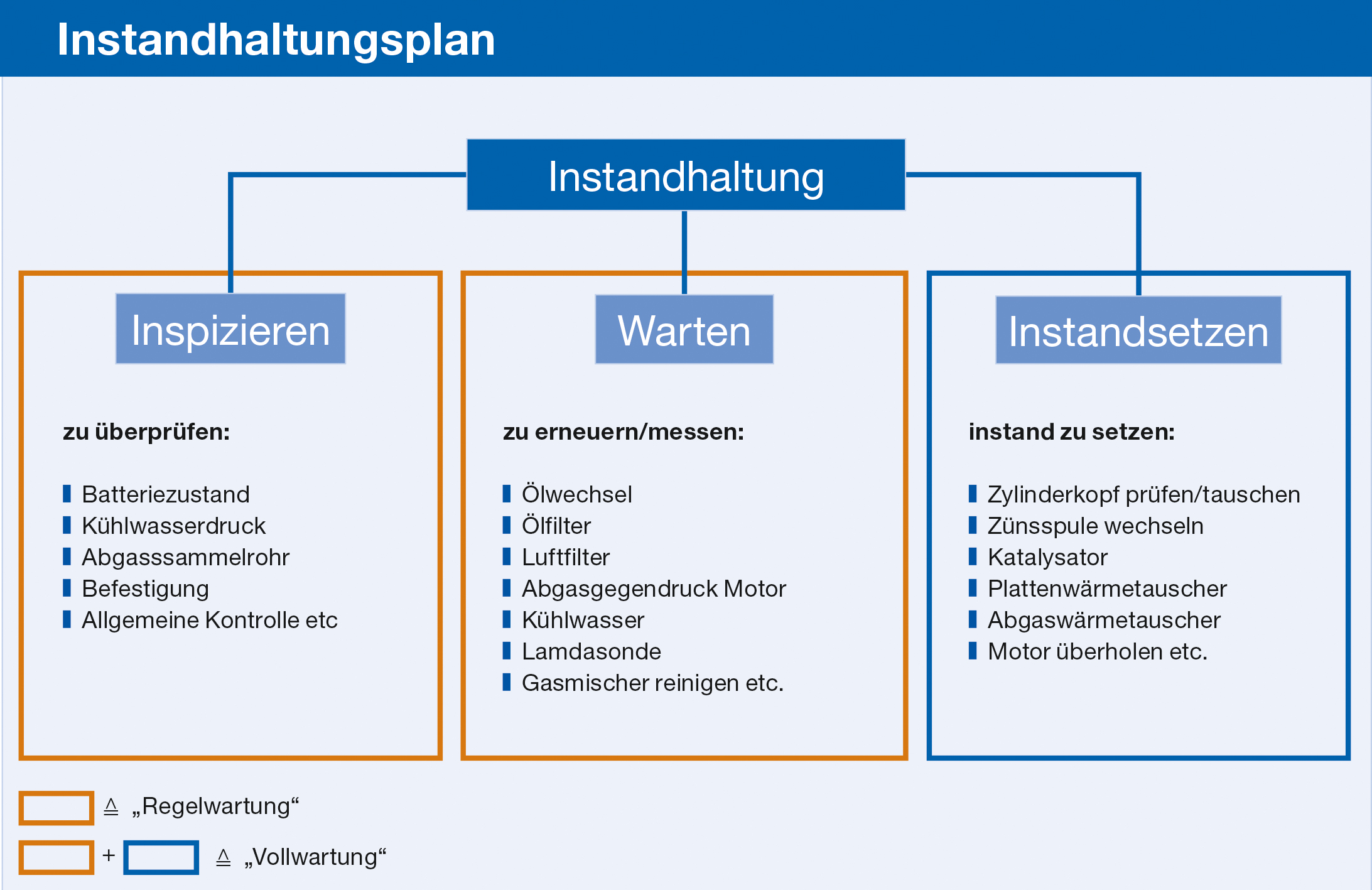 Für den zuverlässigen Anlagebetrieb ist darauf zu achten, dass der Wartungsplan für das Blockheizkraftwerk eingehalten wird. In diesem Plan sind alle Maßnahmen aufgeführt, die in vorgegebenen Abständen umgesetzt werden müssen – ähnlich wie bei einem Automobil. Nur damit ist ein gleichbleibend hoher energetischer Nutzungsgrad gewährleistet und die prognostizierte Laufzeit der Maschine wird erreicht. Darüber hinaus wird der Motor vor schleichend einsetzenden Schäden geschützt, so lassen sich im Einzelfall hohe Kosten vermeiden.