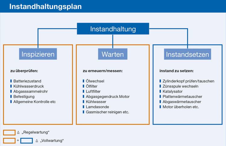 Zur Regelwartung (Teilwartung) gehören Inspektion und Wartung der Anlage. Konkret bedeutet dies unter anderem, dass Batteriezustand, Kühlwasserdruck, Abgassammelrohr und Befestigungen geprüft werden, Dabei kontrolliert der Fachmann die Anlage ganz allgemein. Darüber hinaus werden Öl, Zündkerzen, Ölfilter und Luftfilter gewechselt. Kühlwasser, Lambdasonde und Abgasgegendruck werden kontrolliert sowie der Gas-/Luftmischer gereinigt.