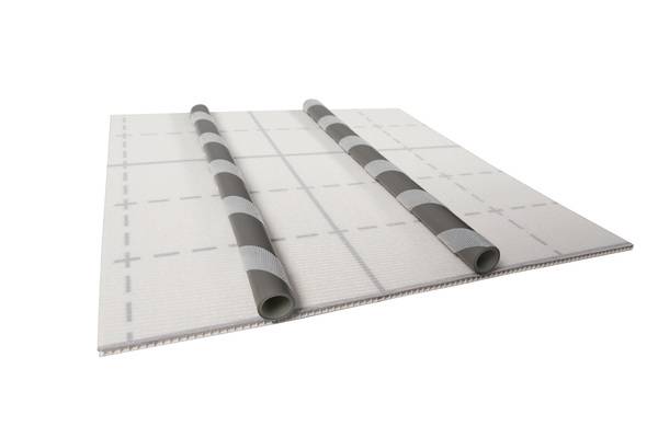 Klettpanel: Das Klettpanel X-Net C17 besteht aus einer leichten, dünnen und stabilen PP-Hohlkammerplatte. Die Faltplatte im Format 2000 x 1000 mm kann auf der bauseitigen Dämmung oder bei der Renovierung direkt auf dem vorhandenen Bodenbelag montiert werden. Die aufkaschierte, reißfeste Klettfolie mit vorgedrucktem 5,5 cm Verlegeraster ermöglicht eine werkzeugfreie Rohrfixierung in optimalem Abstand.