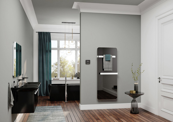 Infrarotheizkörper: Edel, glatt und flächig ist die Formensprache des rein elektrisch betriebenen Infrarotheizkörpers Elveo. Die Front besteht aus Einscheiben-Sicherheitsglas, dessen Rückseite wahlweise schwarz oder weiß eingefärbt ist. Ein eleganter umlaufender Rahmen in Heizkörperfarbe oder edlem Aluminium Hochglanz rundet die moderne Gestaltung ab. Damit das futuristische Design optimal zur Geltung kommt, wird er mit einem sehr geringen Abstand zur Wand vertikal oder horizontal montiert. Zudem stehen Varianten für die Raum- oder die Handtucherwärmung zur Verfügung. Der Elektroheizkörper ist in Leistungsstufen bis zu 800 W erhältlich.