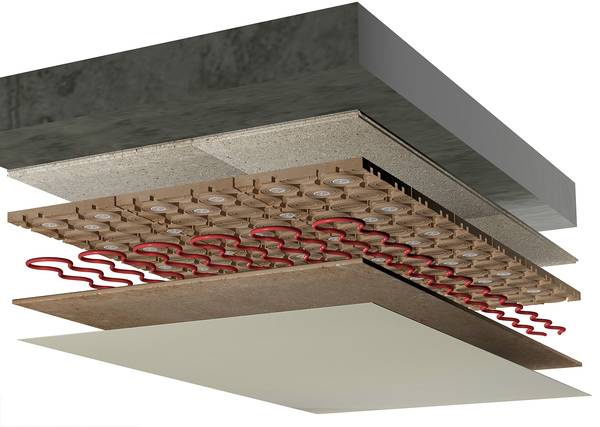 Systemplatte: Für Anwendungen, bei denen der Schallschutz eine besondere Rolle einnimmt, wurde die Systemplatte Rautherm Speed Silent entwickelt. Diese besteht aus Mineralwolle, die als offenporiges Material sehr gut für die Absorption von Trittschall geeignet ist. So weist die Platte einen gemessenen Prüfwert der bewerteten Trittschallminderung von 32 dB nach DIN EN ISO 10140 auf. Dazu kommt eine geringe Brandlast, da Mineralwolle nicht brennbar ist.