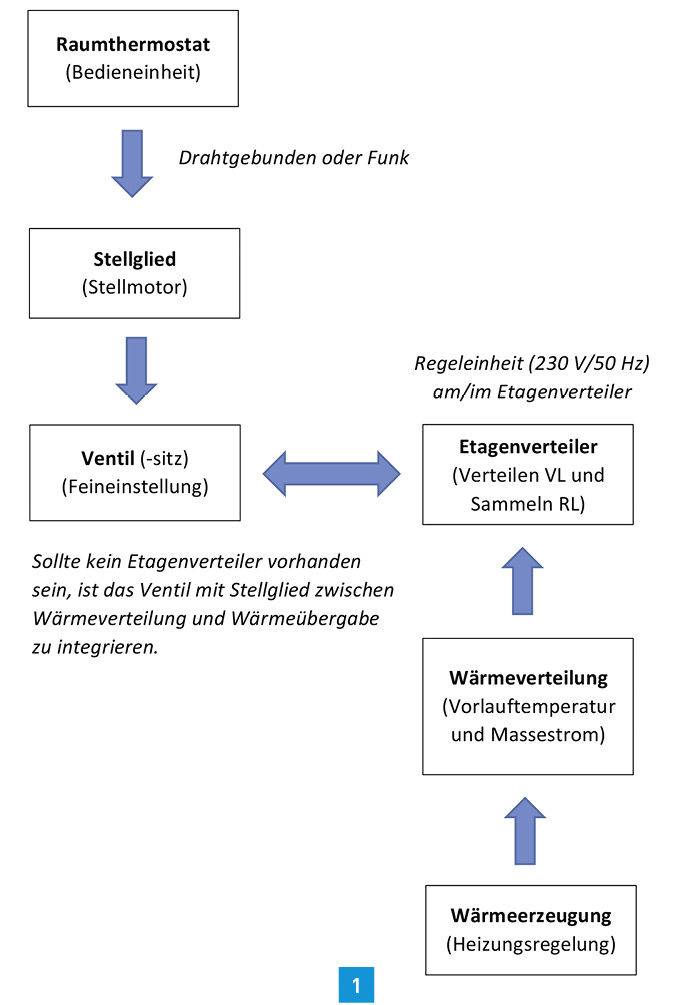 Dementsprechend umfasst diese Nachrüstung neben der Regeleinheit einerseits die Raumthermostate für die einzelnen Räume und andererseits die dazugehörigen Stellglieder. Es können Raumthermostate sowohl drahtgebunden als auch in Funkausführung gewählt werden, wobei Letztere für die Nachrüstung besonders geeignet sind. Grafik 1 zeigt die Komponenten einer Einzelraumregelung und deren Wirkstrecke. Für die Regeleinheit ist eine Spannungsversorgung (230 V/50 Hz) vorzusehen.