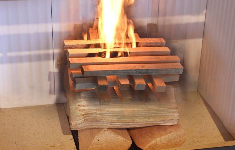 Die gängigste Anzündmethode ist das Brennholz von unten anzufeuern. Besonders für Öfen, die über einen Bodenrost verfügen, bietet sich diese Praktik an. Hierbei werden zunächst zwei Anmachhölzer mit einem handelsüblichen Anzünder dazwischen auf den offenen Rost gelegt. Quer zwei weitere Hölzchen stapeln und anschließend mit kleinem Abstand und der Spaltkante nach unten die Scheite aufsetzen. Je nach Größe des Ofens zwei bis drei mit einem Umfang unter 20 cm verwenden.