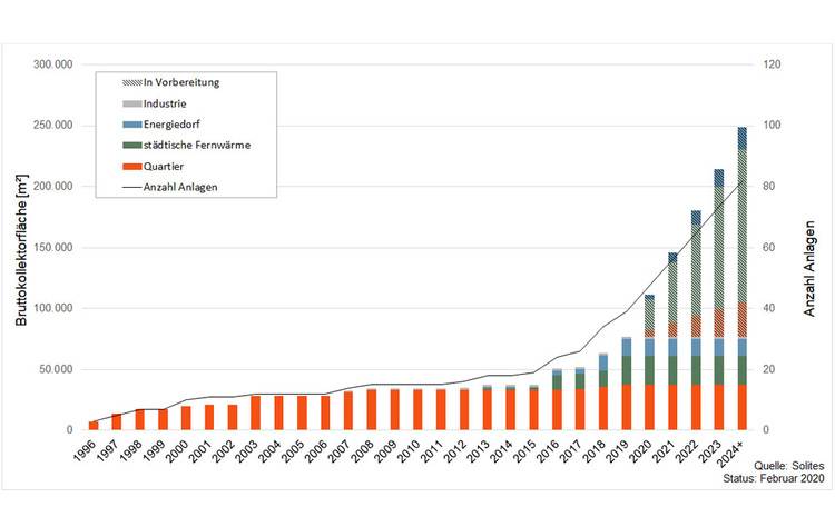 Insgesamt stehen nach Angaben des Steinbeis Forschungsinstituts Solites aus Stuttgart rund 70 Megawatt thermischer Solarleistung in Deutschland für die Fernwärme bereit. Bei einigen dieser Solarwärmeanlagen, deren Kollektorfelder bereits 2019 fertig installiert wurden, ist allerdings die Inbetriebnahme erst für die kommenden Monate vorgesehen.