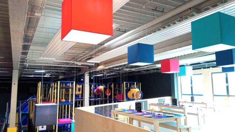 Rund 84 m² Deckenstrahlplatten wurden in der Trampolinhalle verwendet. Dezent verbaut, fallen die weißen Elemente zwischen den flippig bunten Lichtwürfeln, der Leimholzkonstruktion oder hoch oben unter der Hallendecke am Trapezblech kaum auf.