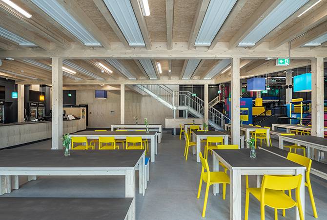 Und damit die Sprungbegeisterten in den Pausen nicht auskühlen, liefern KSP-Deckenstrahlplatten die nötige Wärme im Gastronomie- und Eingangsbereich.